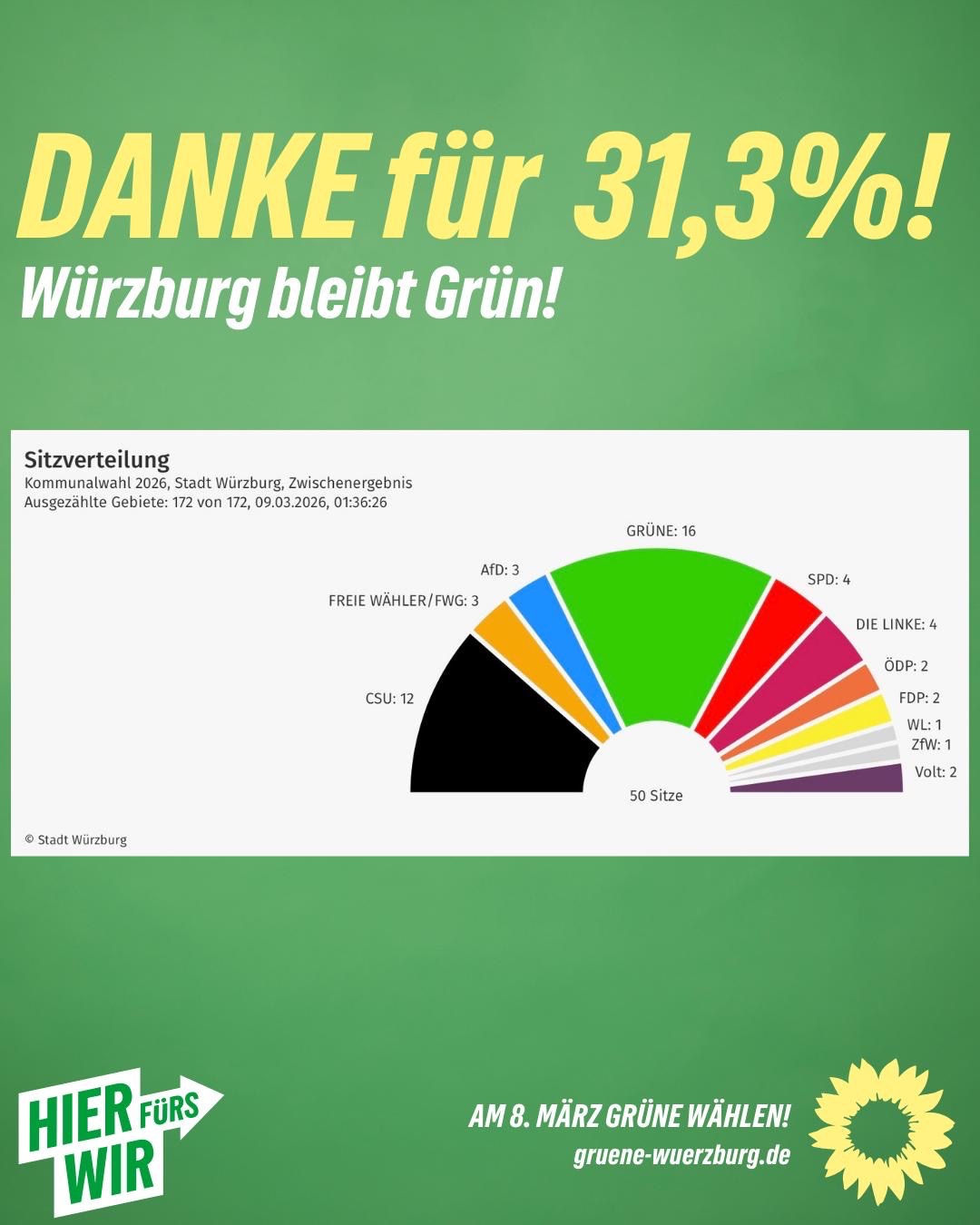 Am Ende steht ein überwältigendes Ergebnis: 31,3 % für Bündnis 90/Die Grünen. Damit bleiben wir erneut die stärkste Fraktion im Würzburger Stadtrat und halten unsere 16 Sitze. Dieses Vertrauen der Würzburgerinnen und Würzburger bedeutet uns sehr viel und erfüllt uns mit großer Dankbarkeit.