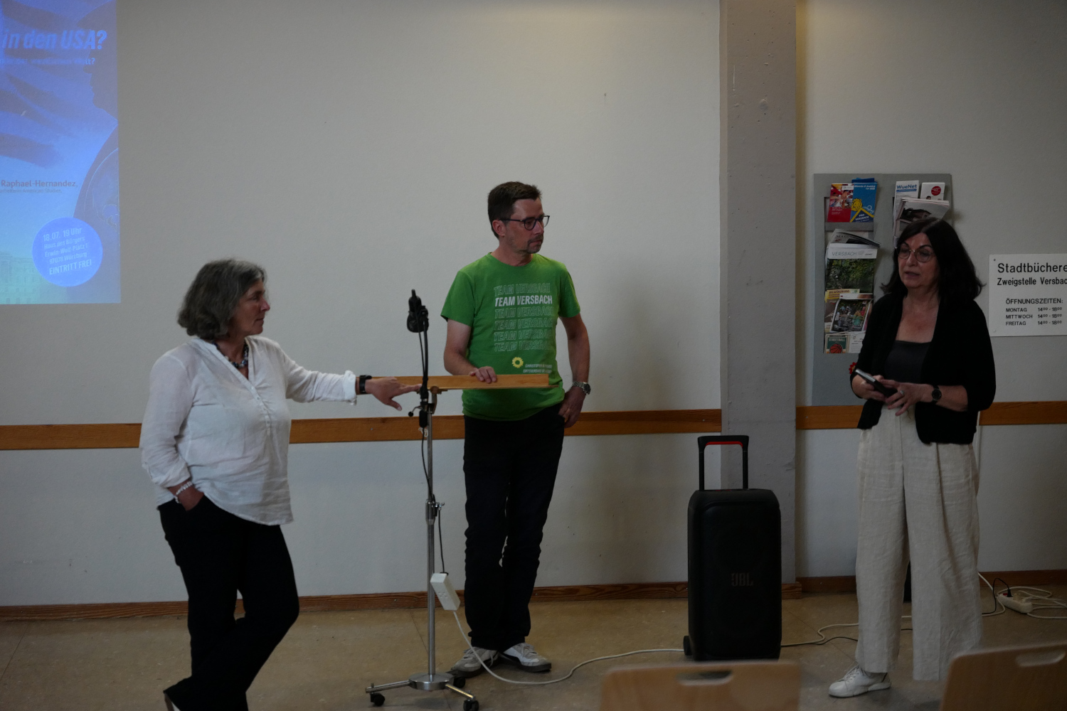 Am 18. Juli 2025 lud der Ortsverband Versbach von BÜNDNIS 90/DIE GRÜNEN ins Haus des Bürgers ein. Unter dem Titel „Was ist los in den USA?“ sprachen die Landtagsabgeordnete Kerstin Celina und PD Dr. Heike Raphael-Hernandez (Uni Würzburg) und Stadträtin Molina Klingerüber die aktuelle politische Lage in den Vereinigten Staaten.